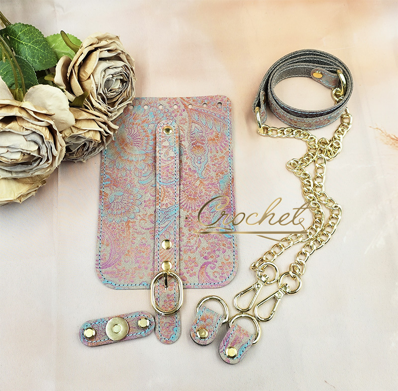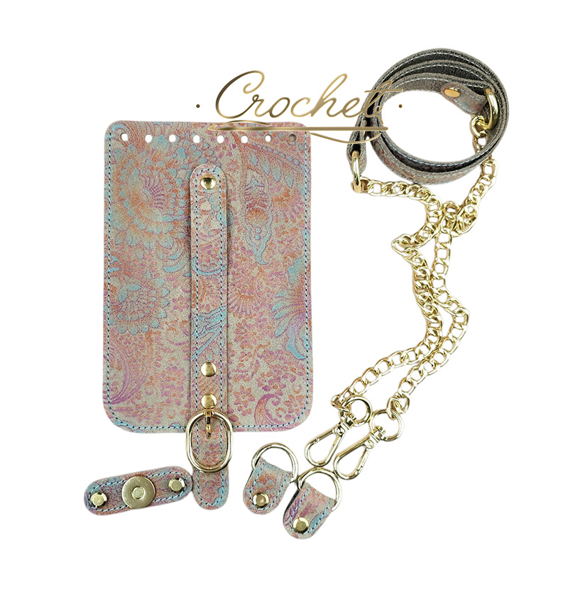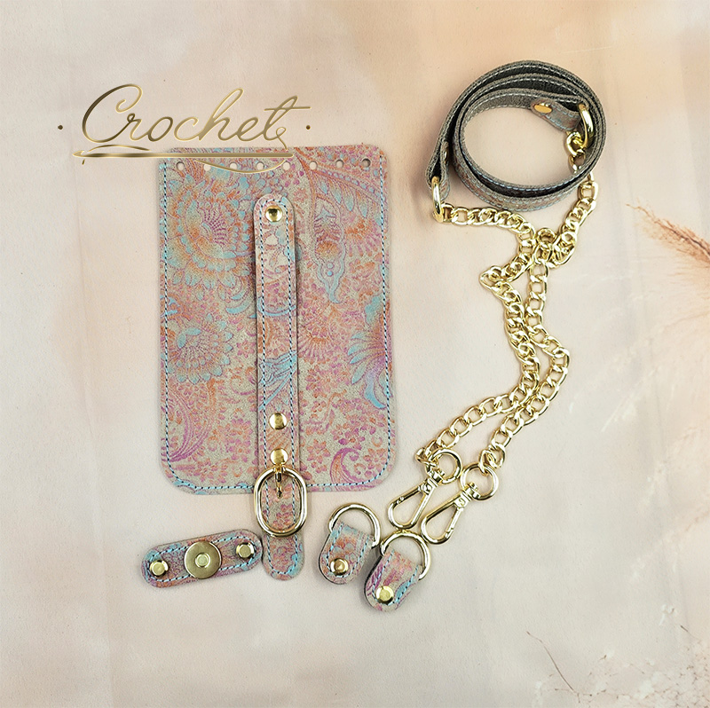ZESTAW SKÓRZANY DO TOREBKI – CROCHET – KLAPKA 12x18cm WRZOSOWO TURKUSOWY PRINT OBSZYCIE BŁĘKITNE OKUCIA ZŁOTE IT/ŁAŃCUCH BEIGE EDITION